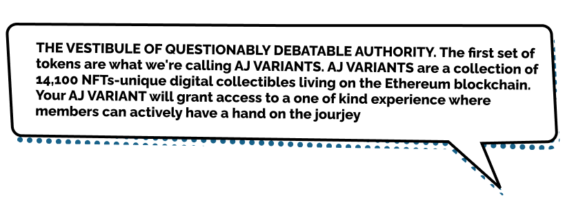 There will be 14,100 AJ VARIANTS in the set. 10,000 of these will be released during the initial minting. Buying an AJ VARIANT from the initial drop will cost costs TBD ETH. There are no price tiers; The other 4,100 tokens will be released as we move through the checklist and used for giveaways, community participation event rewards, online event prizes, story event dutch auctions as well as for the cast and crew.