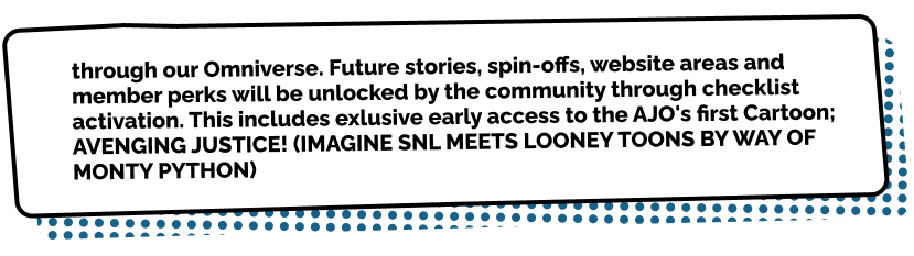 earn about the characters of EARTH ALPHA (the AJO's main earth), the planets throughout the omniverse, and take a peak around the library to see all their omniversal counterparts!Back before the creator of the AJO knew WTE NET's were, he managed to assemble a cast of legendary talent (and Eric Vale) for a spec pilot featuring the characters. When he explained his plan to them and asked them for their continued involvement in this extremely new and exciting creative space, none of them waivered. Check out the bios of the people who bring these characters to life!